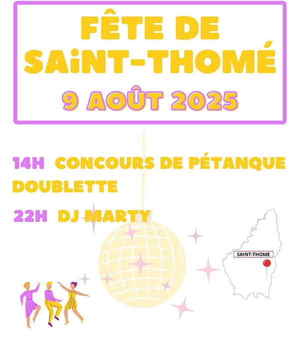 Fête de Saint-Thomé Juil 28, 2025 | Evénements Samedi 9 août 2025 14h : concours de pétanque doublette 22h : DJ Marty Restauration rapide